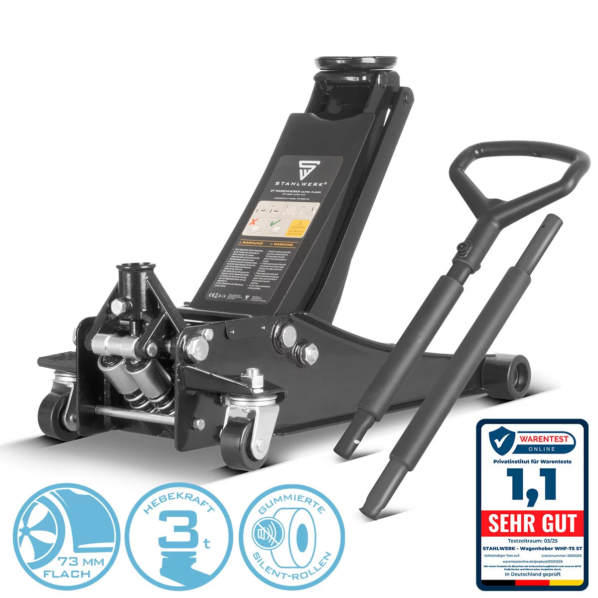 Stahlwerk jack with 3 t of load capacity, rubberized rollers, double lifting pistons and 73-500 mm lifting area | Extra flat maneuvering trolley | Hydraulic trolleys | Black Autobery