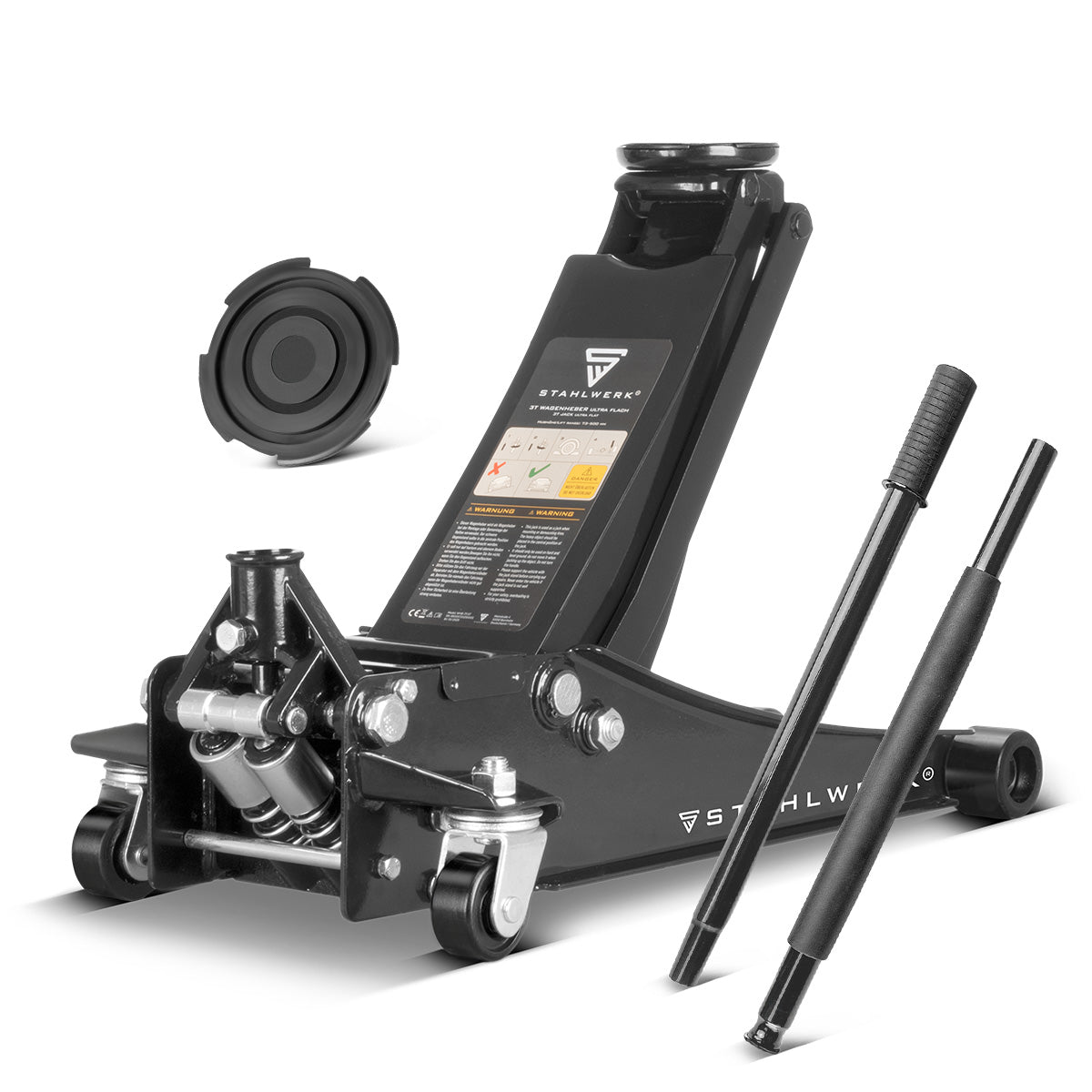 STAHLWERK Wagenheber WHF-73 ST mit 3 t Tragkraft, Long-Life-Stahlrollen, Doppelhubkolben und 73-500 mm Hubbereich | Extra flacher Rangierwagenheber | Hydraulik-Wagenheber | Schwarzer Autoheber