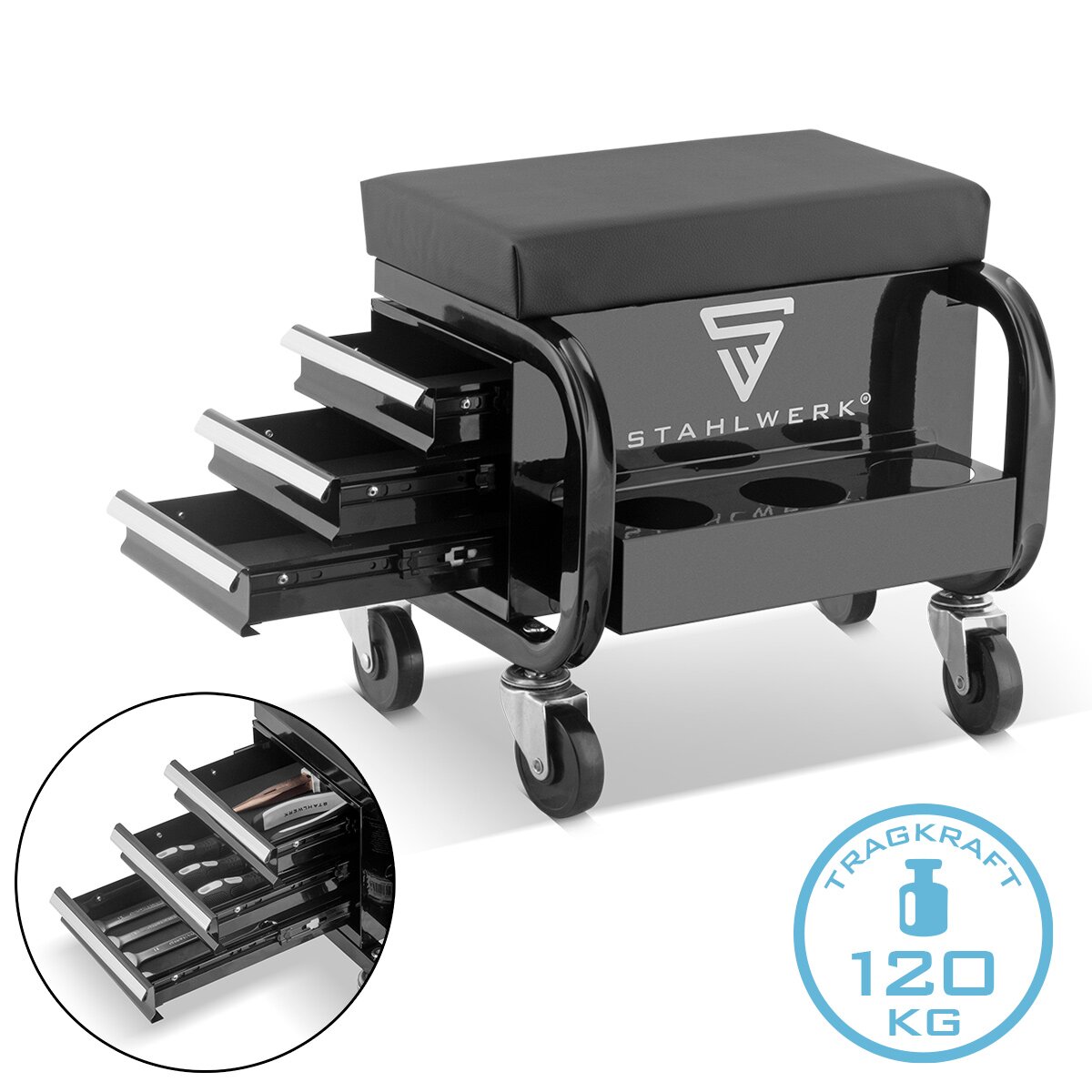 Stahlwerk workshop stool MWH-3 ST with 120 kg load capacity workshop seat | Workshop chair | Roll stool | Work stools | Workshop troll seat with drawers, carelessly steering rollers and can holders