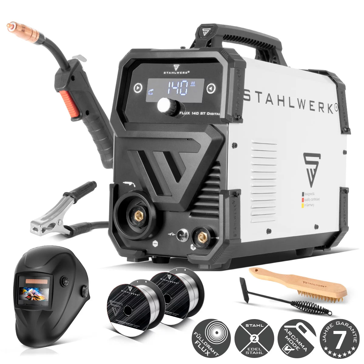 Steelworks welding machine Flux 140 ST Digital with 140 A full equipment, synergic wire feed, lift-tig and ARC/MMA function for welding without protective gas