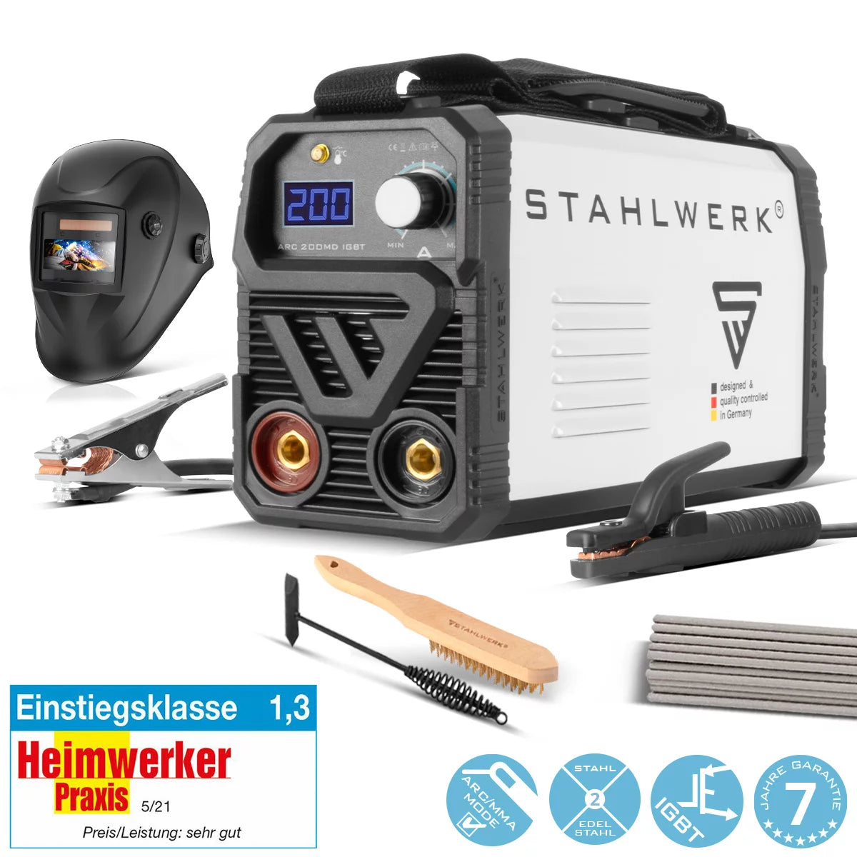 Stahlwerk Arc 200 MD Machine de soldadura Equipo completo - DC MMA | E-Hand | Inverter Lift-Tig con 200 amperios, tecnología IGBT y junta única, garantía del fabricante de 7 años