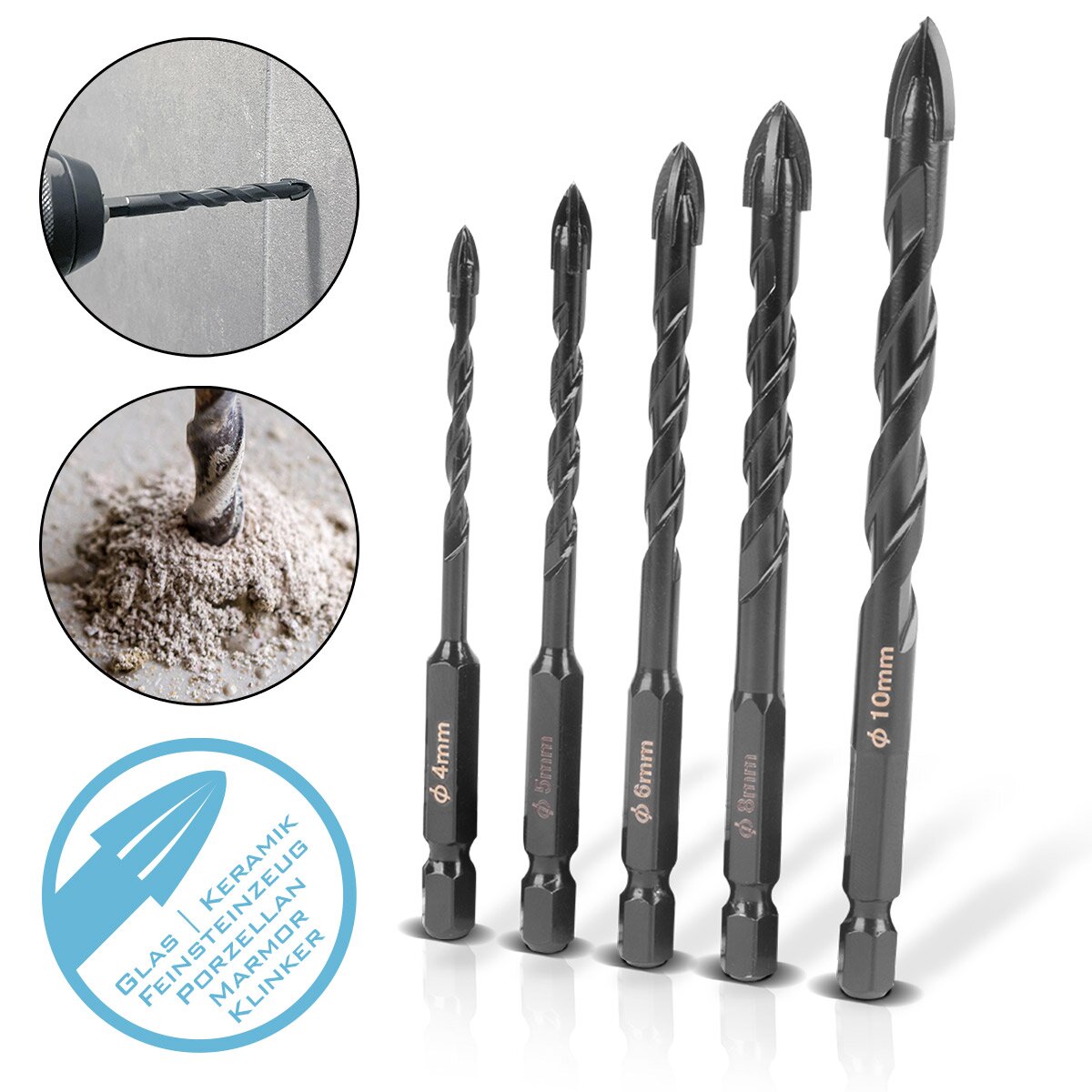 Foret en verre en acier | Drillage de carreaux | Drillage en céramique 5 ensemble 4 | 5 | 6 | 8 | 10 mm avec enregistrement de la hanche de 1/4 de pouce pour trous en verre, carreaux, céramique, porcelaine, clinker, porcelaine en porcelaine, marbre