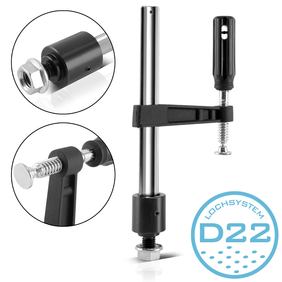 Pince de serrage en acier / pince à vis 80 x 200 mm avec boulon de fixation, arrêt et vis de sécurité pour les tables de soudage avec un système de trous de 22 mm