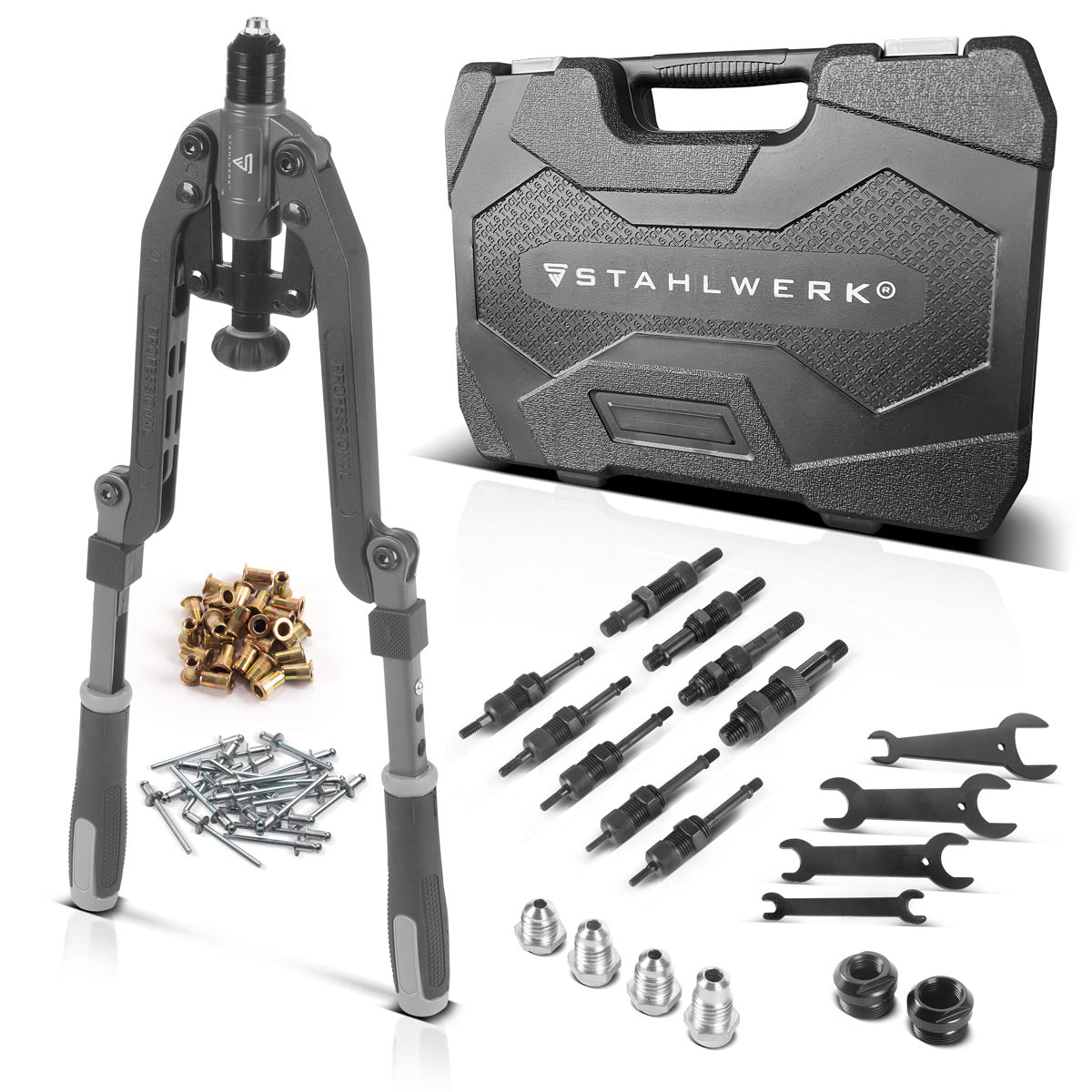 STAHLWERK Nietmuttern- und Blindnietenzangen Set 85-teilig | vielseitige 2-in-1-Nietzange zum Setzen von Blindnieten und Nietmuttern | Multifunktionszange im praktischen Koffer | hochwertiges Nietwerkzeug inkl. Nieten und Gewindedornen