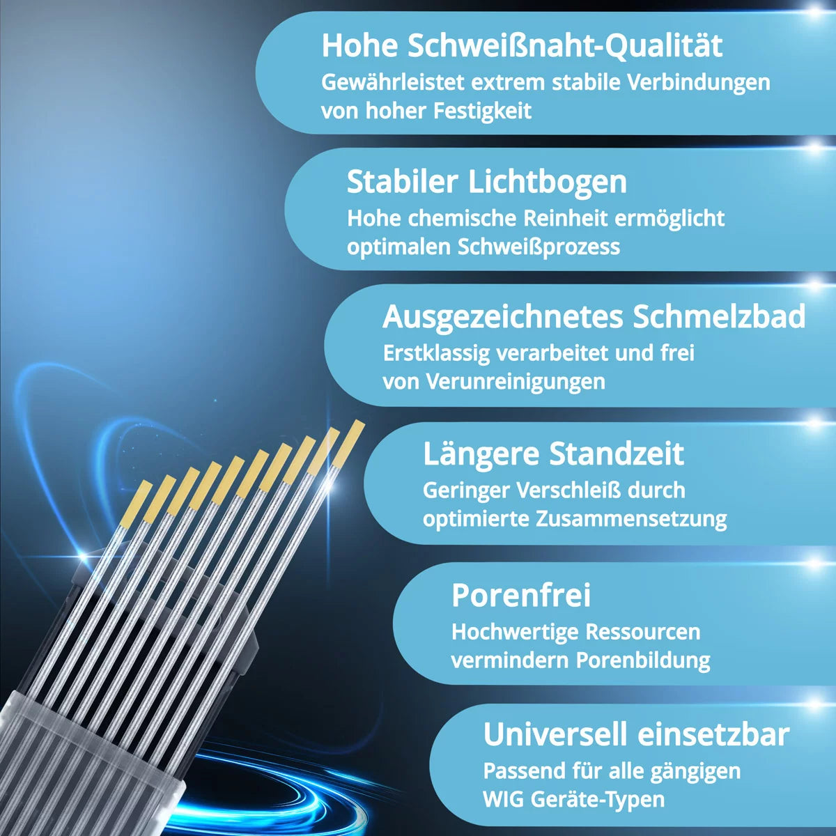 Elettrodi di tungsteno in acciaio / elettrodi di saldatura 2,4 x 175 mm WL15 oro nel set pratico 10 set