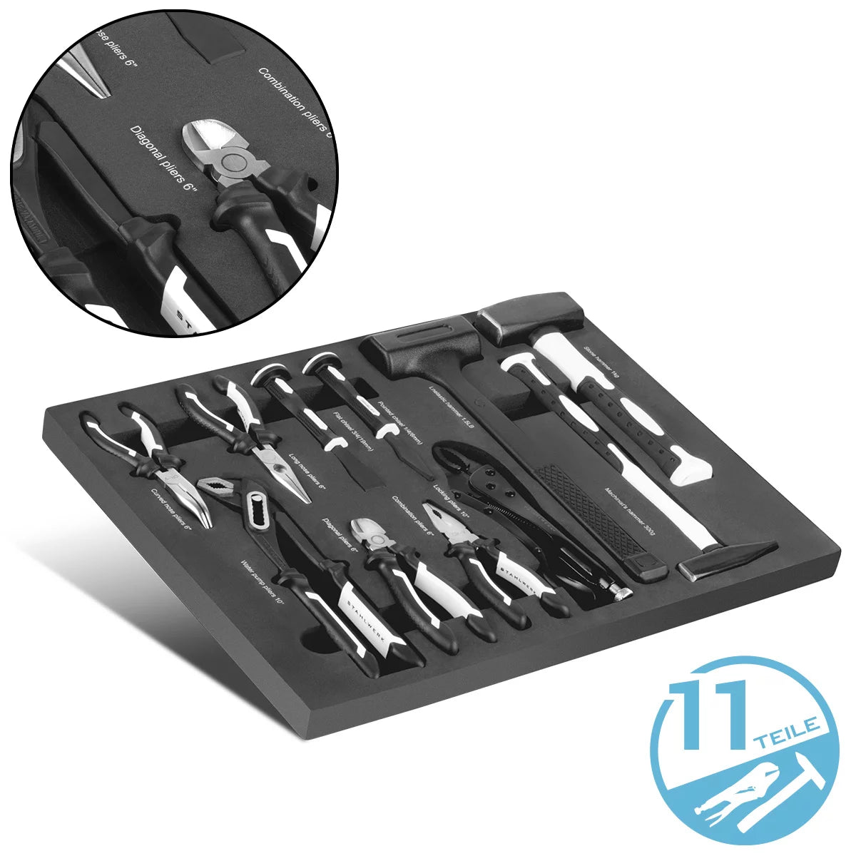 Set di strumenti professionali a 11 pezzi Steelworks con inserto in schiuma per auto da workshop | Strumento di alta qualità nell'intarsio per auto utensili | Tra cui pinze, martelli e scalpellini