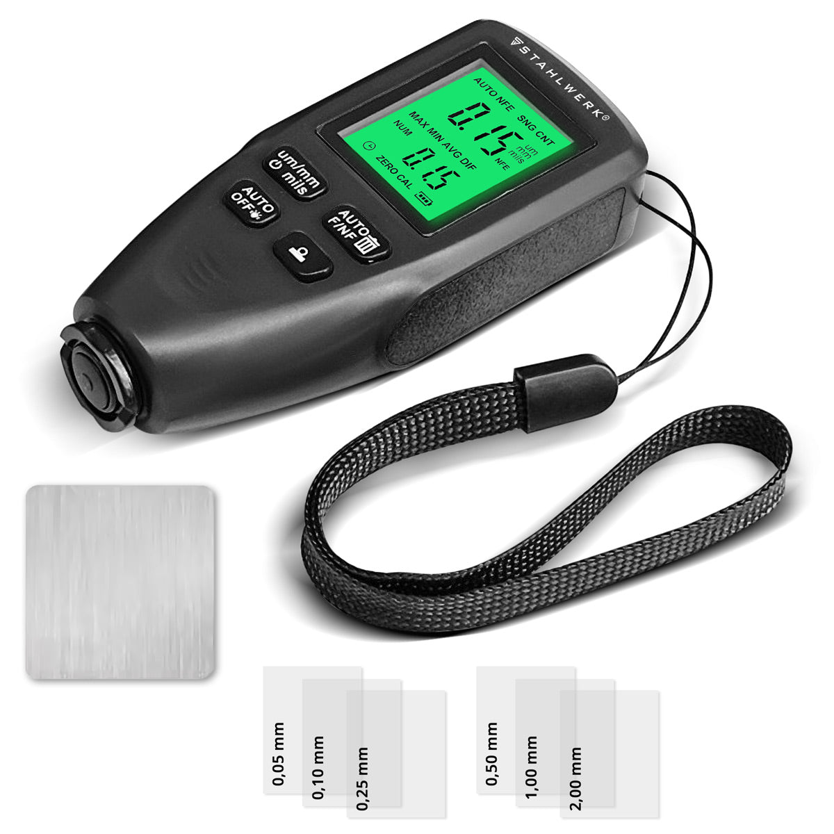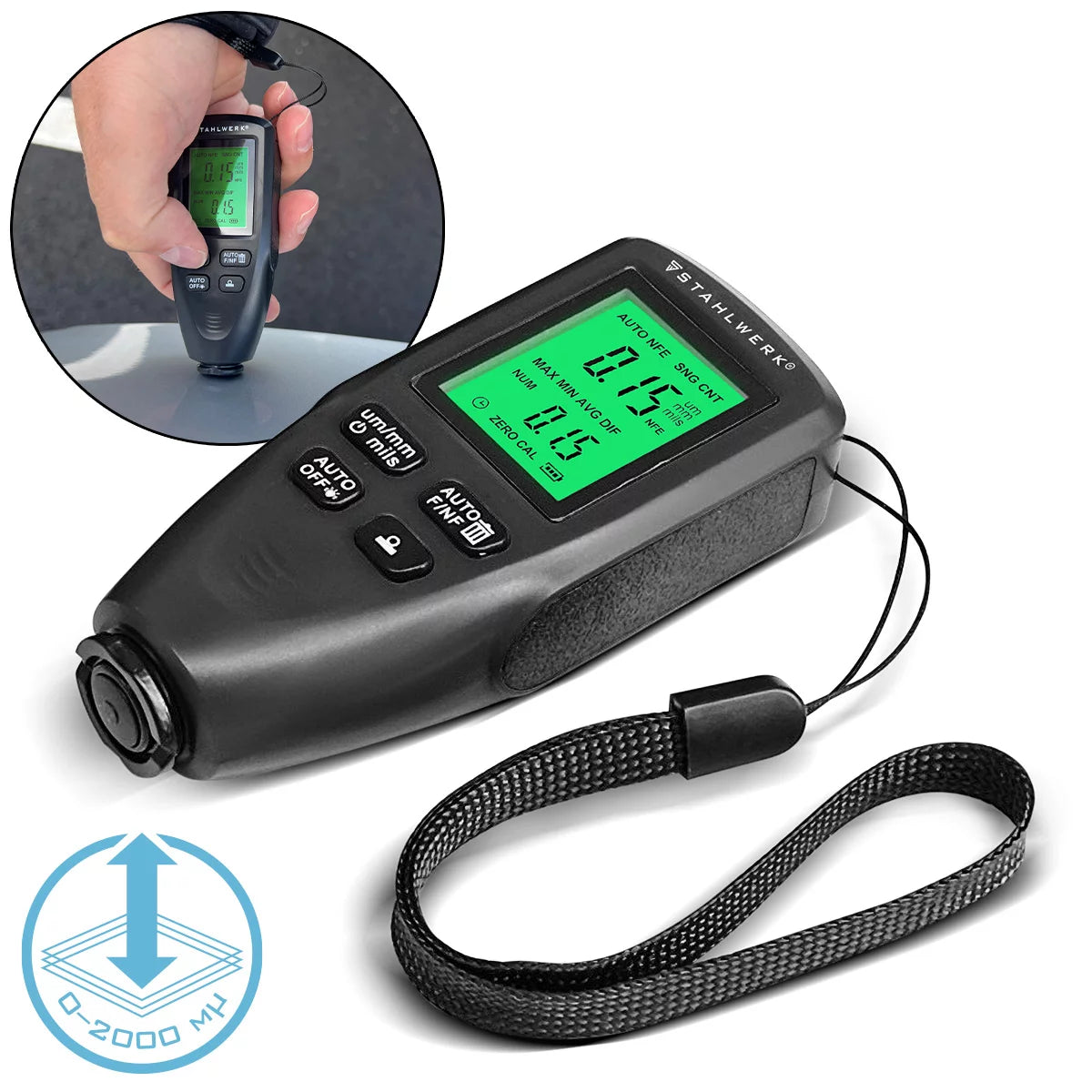 STAHLWERK Schichtdickenmesser | Kompakter Lackdickenprüfer 0-2000 µm für KFZ und Materialprüfung | Dual-Sonde-Messgerät zur Bestimmung von Lackdicken | Präziser Fe/NFe Lackdickenmesser für Metall