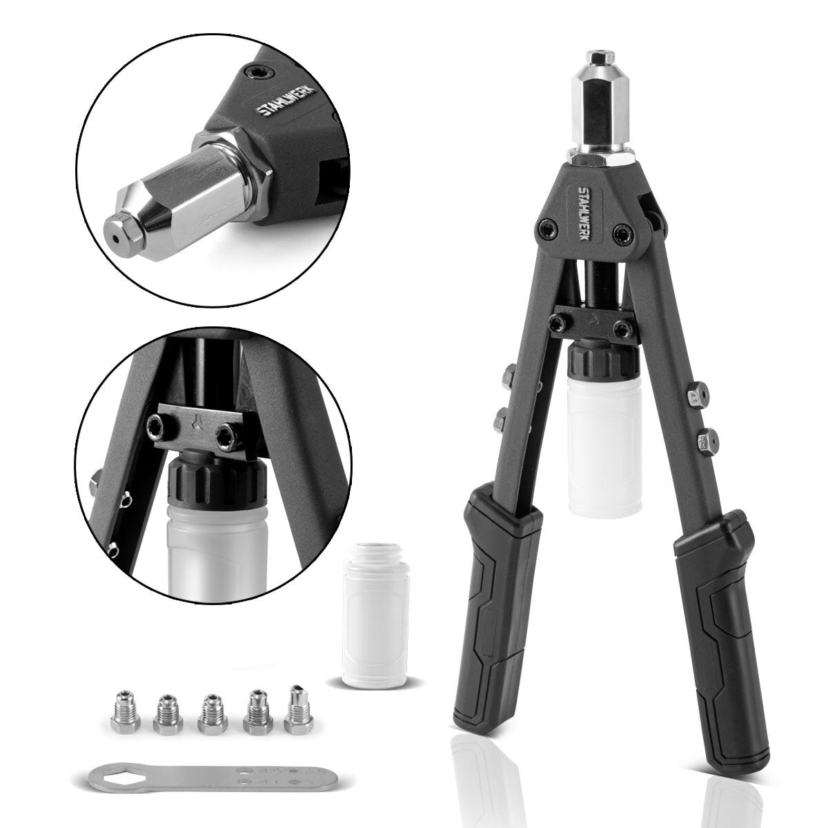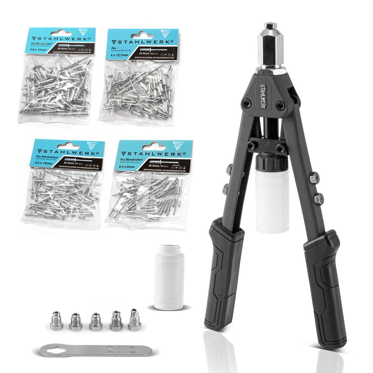 STAHLWERK HNZ-130 ST Robuste Profi-Hebelnietzange und Spanndornzange / Blindnietzange aus vernickeltem Chrom Molybdän Stahl - 8 teiliges Set inklusive 200 Nieten und 5 Wechseleinsätzen