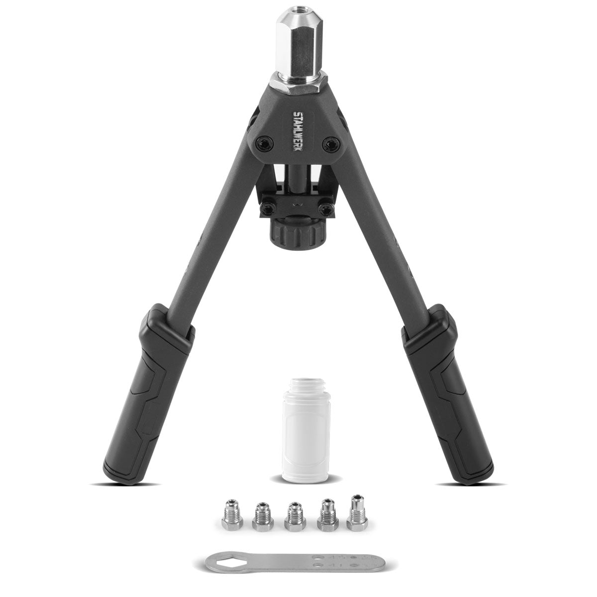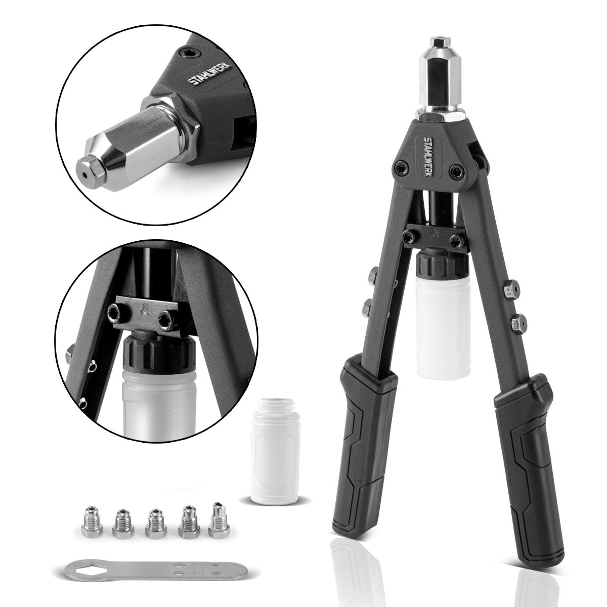 STAHLWERK HNZ-130 ST Robuste Profi-Hebelnietzange und Spanndornzange / Blindnietzange aus vernickeltem Chrom Molybdän Stahl inklusive 5 Wechseleinsätzen