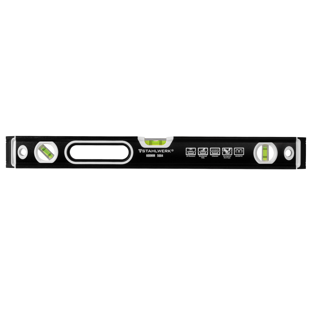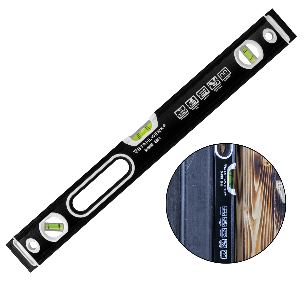 STAHLWERK Wasserwaage Aluminium Magnetwasserwaage 600 mm lang magnetisch 3 Libellen 45 90 180 Grad mit praktischem Haltegriff und Hängevorrichtung