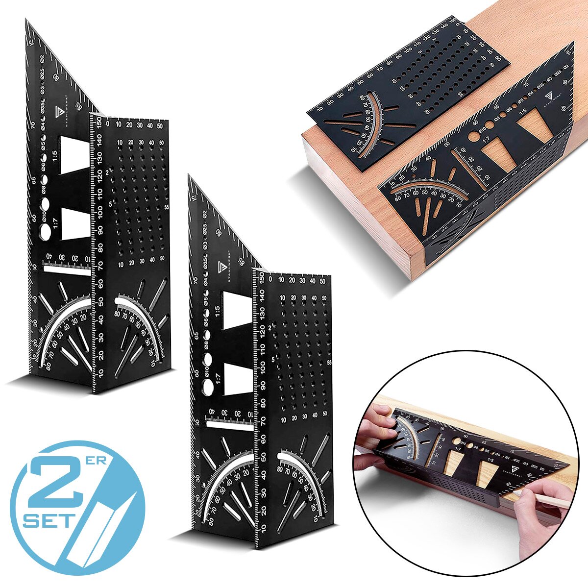STAHLWERK 2er Set Gehrungswinkel-Lineal mit Anschlag und Bohrlehre 3D-Winkel | Zimmermannswinkel | Aluminium-Winkel | Gehrmaß | Winkelmesser zum präzisen Messen, Anreißen, Markieren und Zeichnen