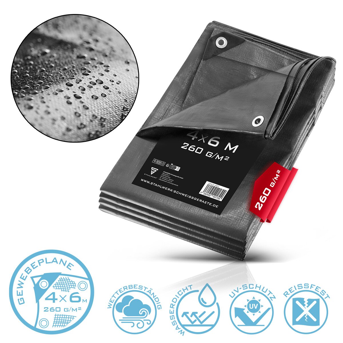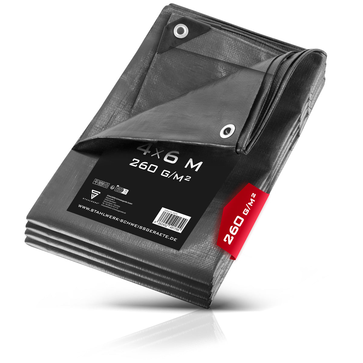 STAHLWERK Abdeckplane mit Ösen 4 x 6 m 260 g/m² wasserdichte Schutzplane | Gewebeplane | Gartenplane | Bootsplane | Holzplane | PE Plane
