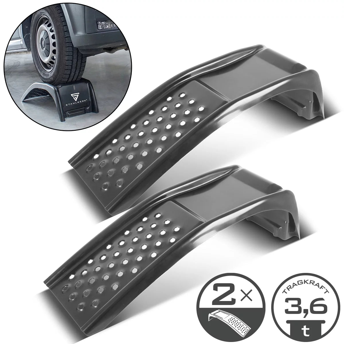 STAHLWERK Auffahrrampen | 2 Stahl-Auffahrrampen mit 3.6 t Traglast pro Paar | Für Reifenbreiten bis 230 mm | 900 x 300 x 240 mm | Fahrzeug-Auffahrrampen für Wartung und Service | Auffahrkeile PKW/LKW