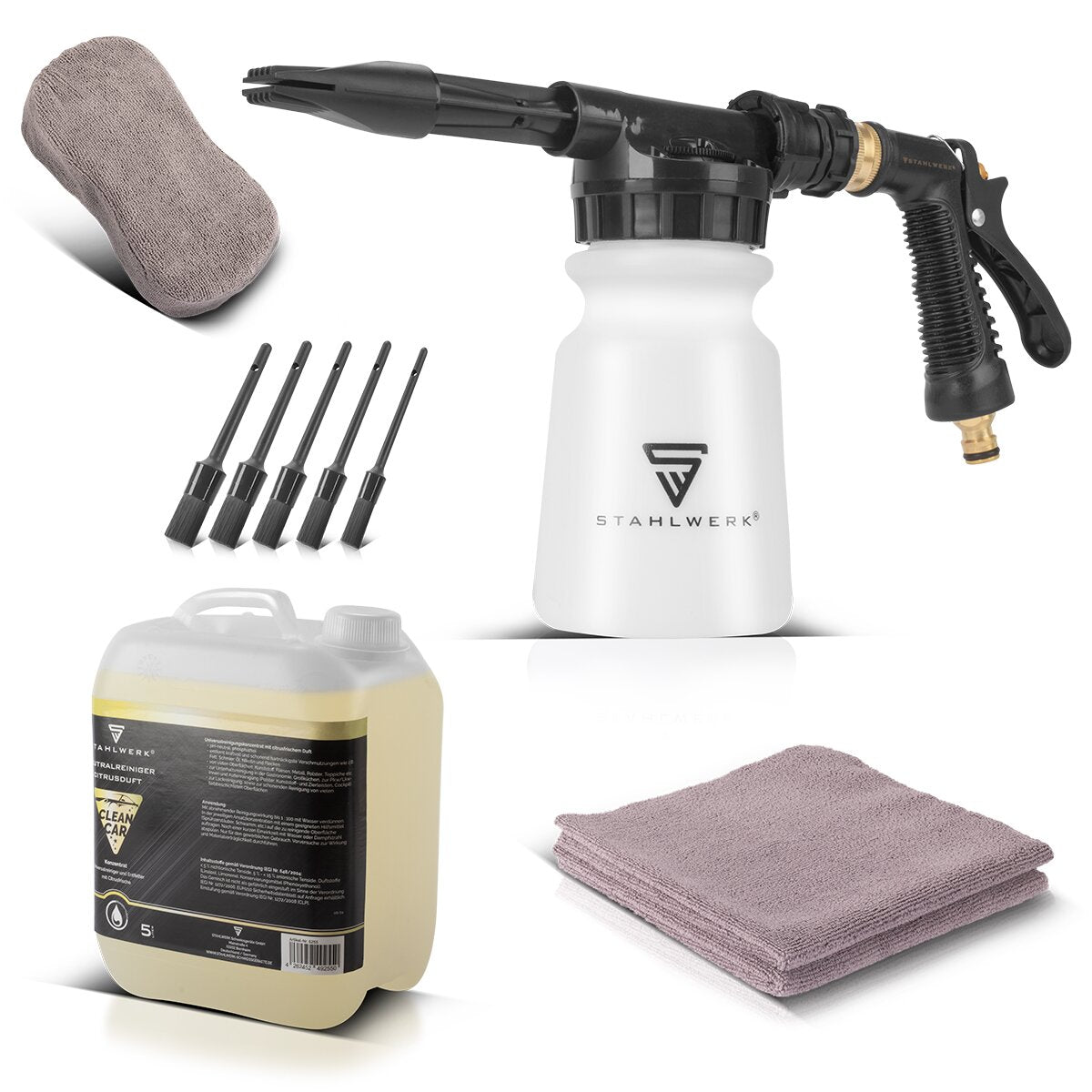 STAHLWERK Autowasch-Schaumspritzpistole RP-91 ST mit abnehmbarem Behälter für Reinigungsmittel im Set mit 5 Liter Universalreiniger, Detailing-Pinseln, Autoschwamm und Mikrofaser-Tüchern