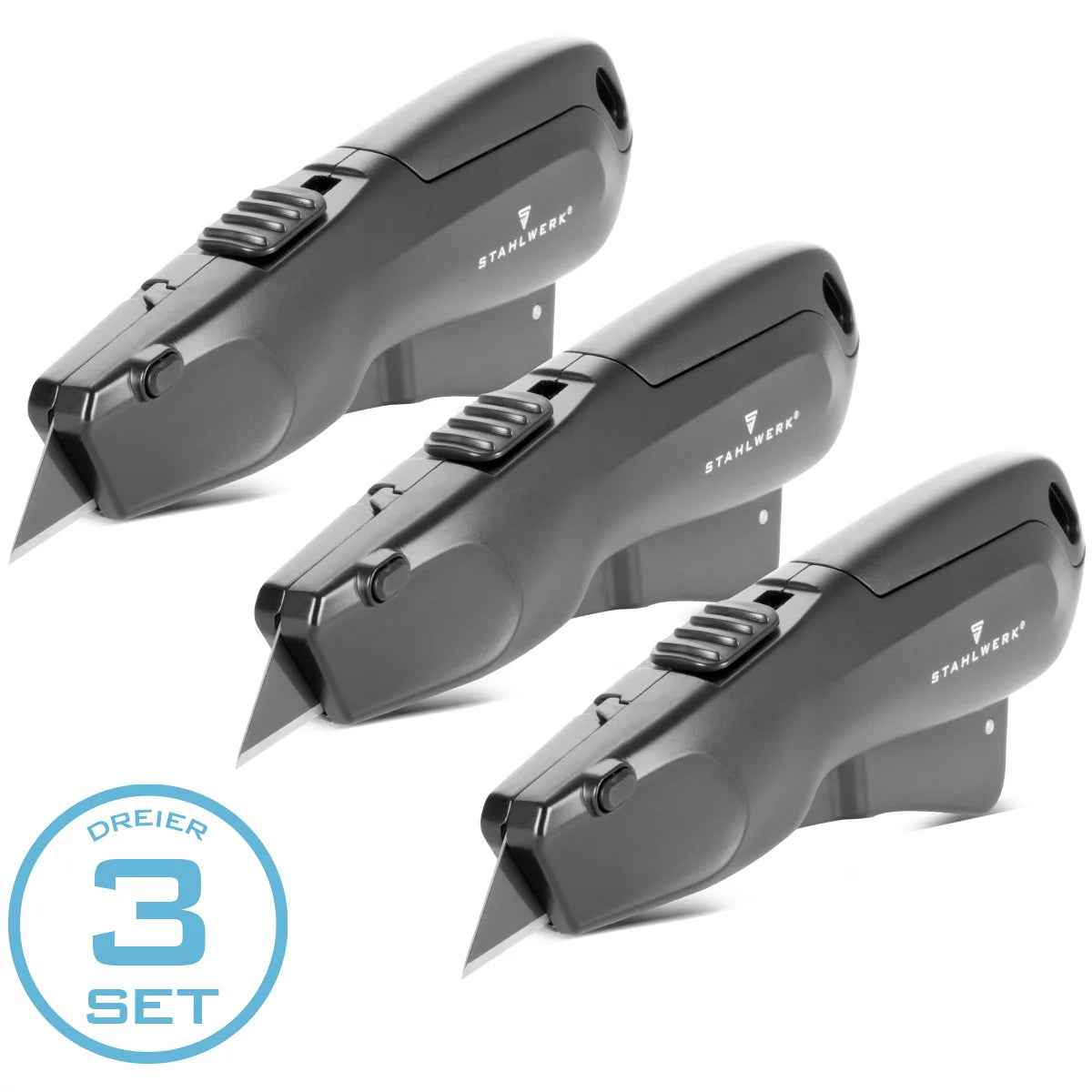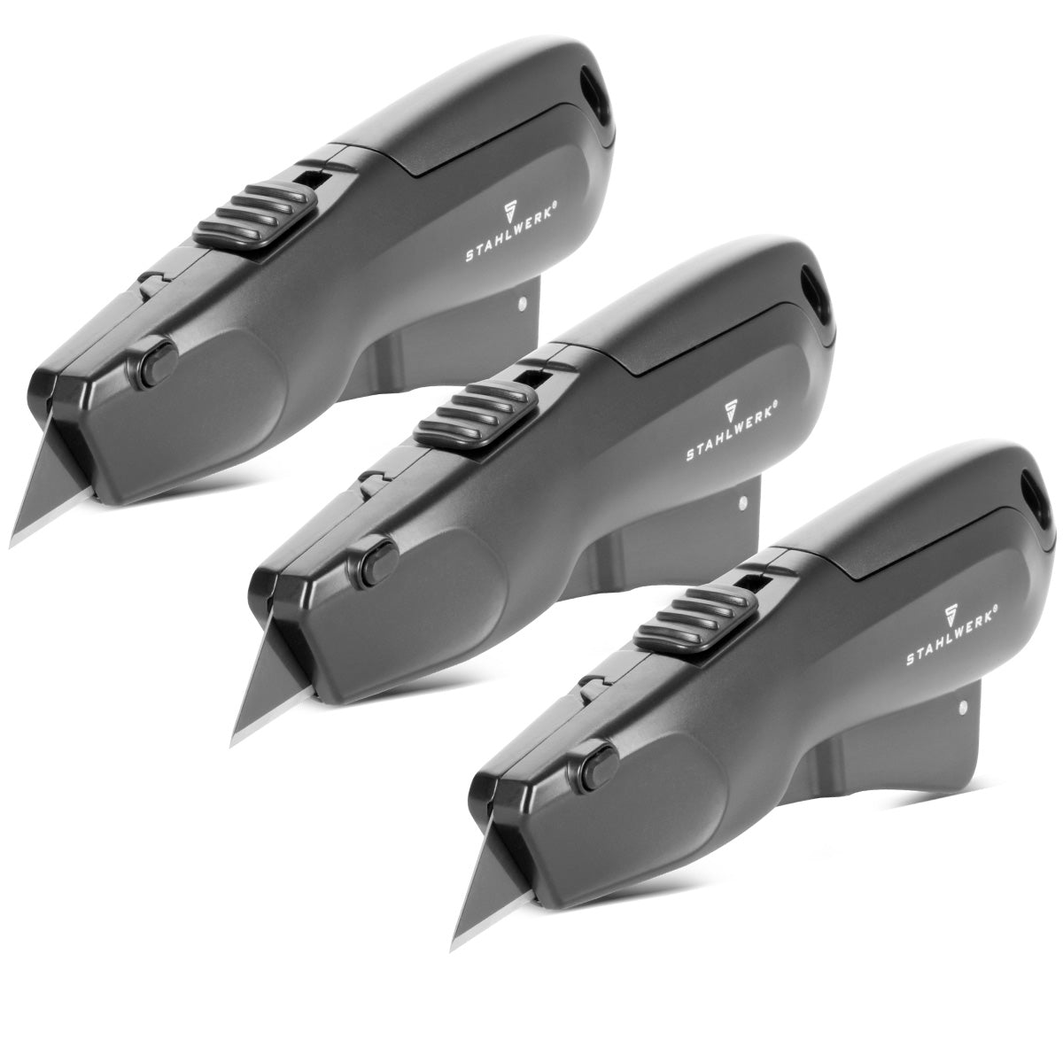STAHLWERK Cuttermesser UCM-19 ST 3er Set mit Schnellwechsel-Klinge, automatischem Klingenrückzug und Sicherheitsverriegelung Cutter | Teppichmesser | Sicherheitsmesser | Paketmesser | Kartonmesser