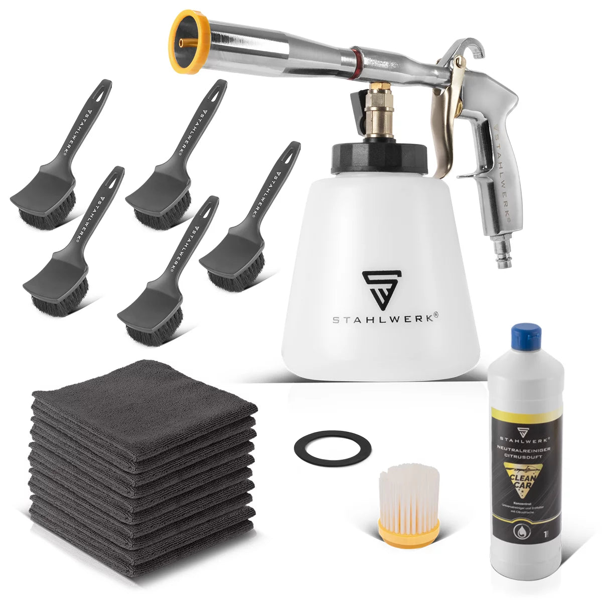 STAHLWERK Druckluft-Reinigungspistole RP-92 ST im Set mit 1 Liter Universalreiniger, Felgenbürsten und Mikrofaser-Tüchern | Profi Druckluft Reiniger mit Tornado-Effekt