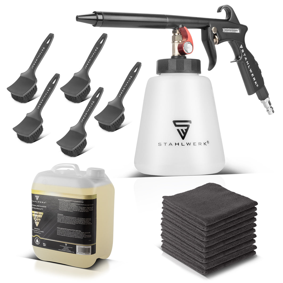 STAHLWERK Druckluft-Reinigungspistole RP-93 ST im Set mit 5 Liter Universalreiniger, Felgenbürsten und Mikrofaser-Tüchern | Druckluftreiniger für Autowäsche