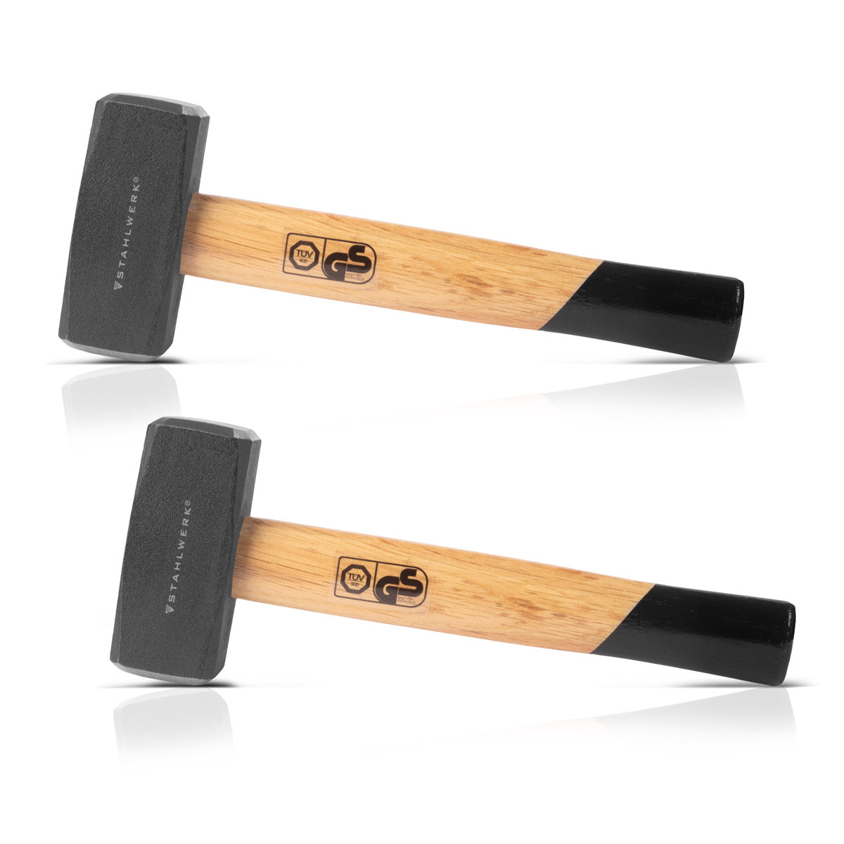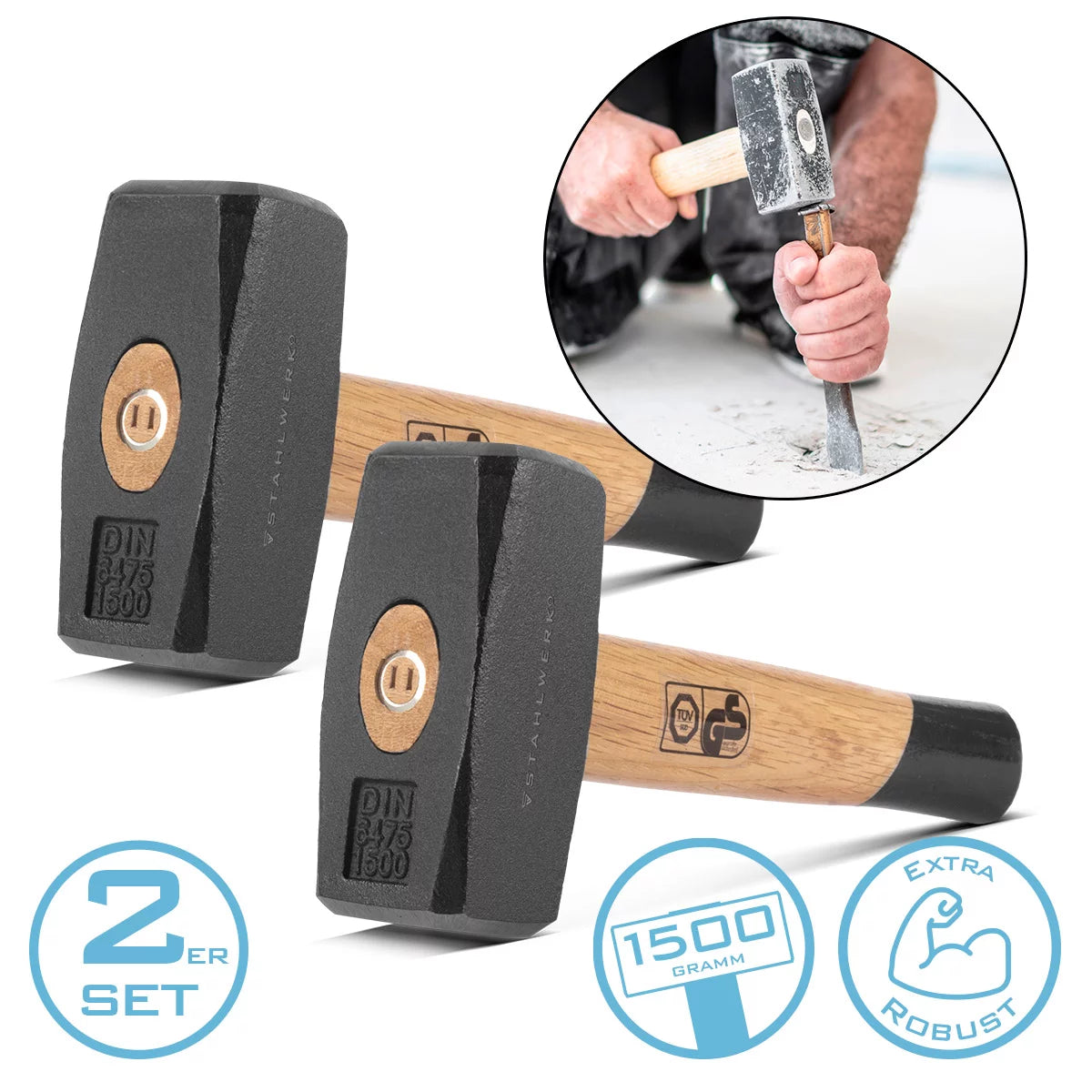 STAHLWERK Fäustel 2er Set mit 1500 g Hammerkopf | Plattenhammer aus gehärtetem und lackiertem Carbon-Stahl | hochwertiger Hammer mit bruchfestem Hartholzstiel | TÜV + GS geprüft