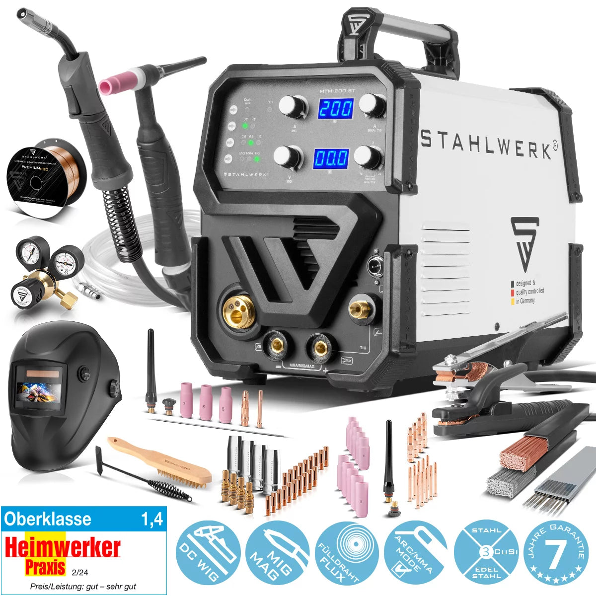 STAHLWERK Kombi-Schweißgerät MTM-200 ST Vollausstattung 3-in-1 Schutzgas-Schweißgerät | Inverter mit 200 A und synergischem Drahtvorschub für WIG | MIG MAG | MMA