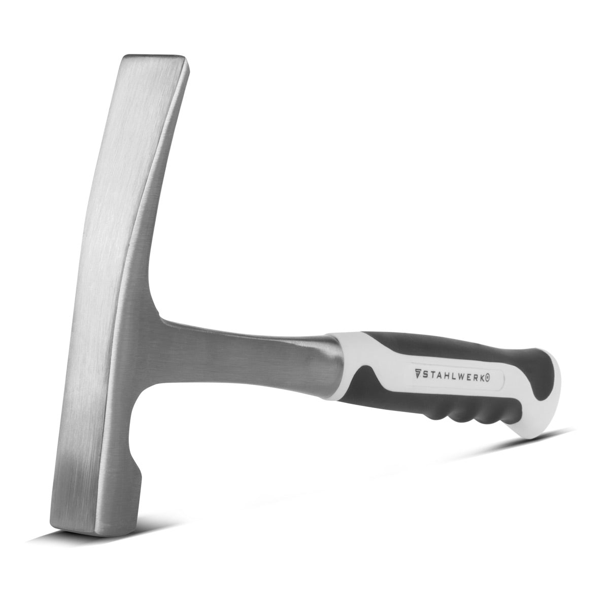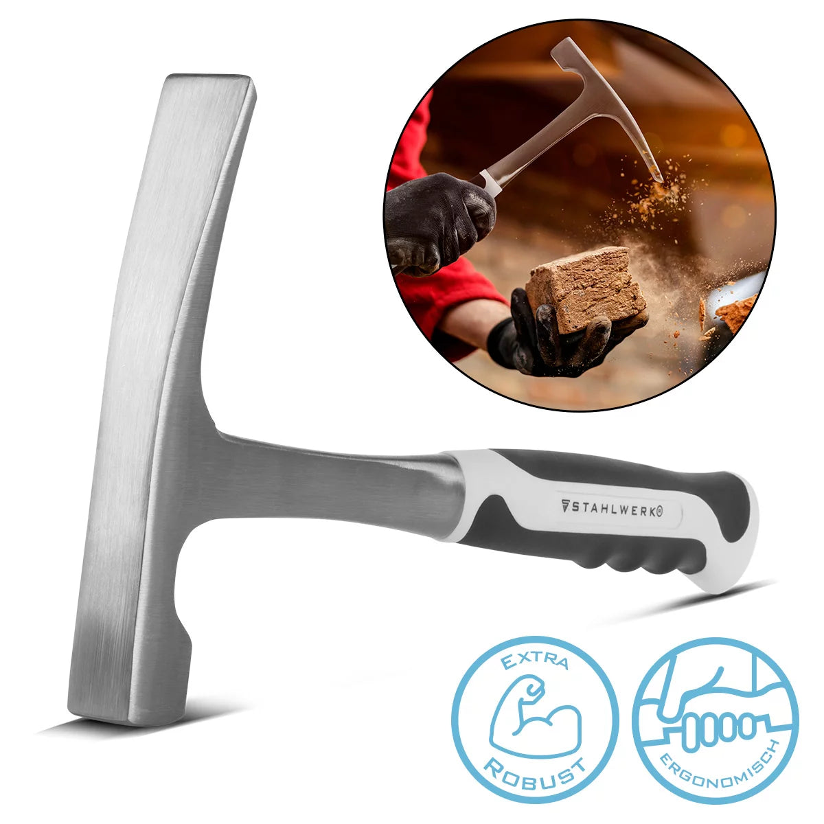 STAHLWERK Maurerhammer aus geschmiedetem Carbon-Stahl | hochwertiger Ziegelhammer mit bruchsicherem Fiberglas-Griff | Steinhammer mit Meißel zum Behauen von Ziegeln und Steinen