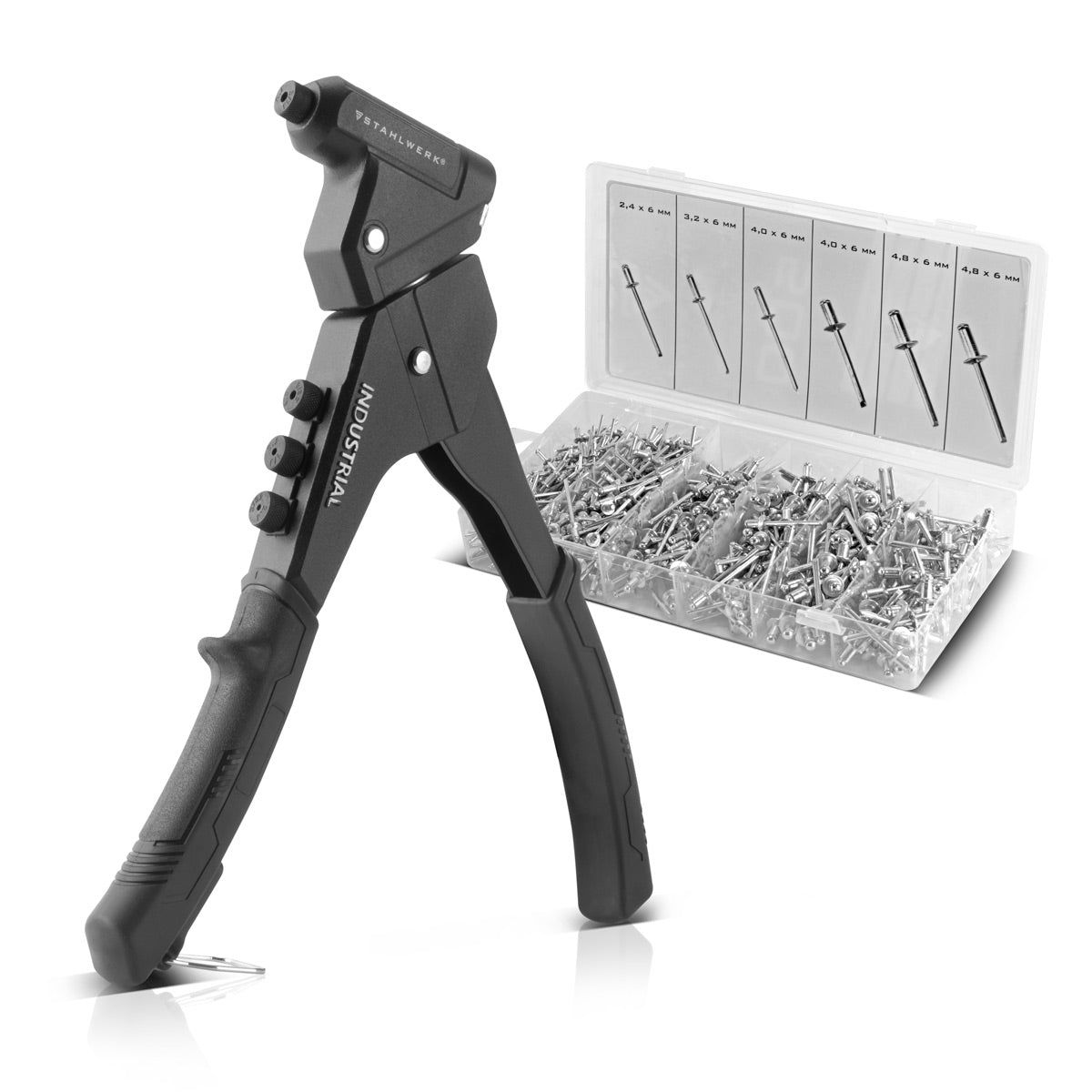 STAHLWERK Nietzangen-Set NZ-280 ST 360° Blindnietzange | Hebelnietzange | Popnietzange | Nietmutternzange | Nietpistole | Nietwerkzeug | Einhand-Nietzange mit 4 Wechsel-Aufsätzen und 500 Blindnieten