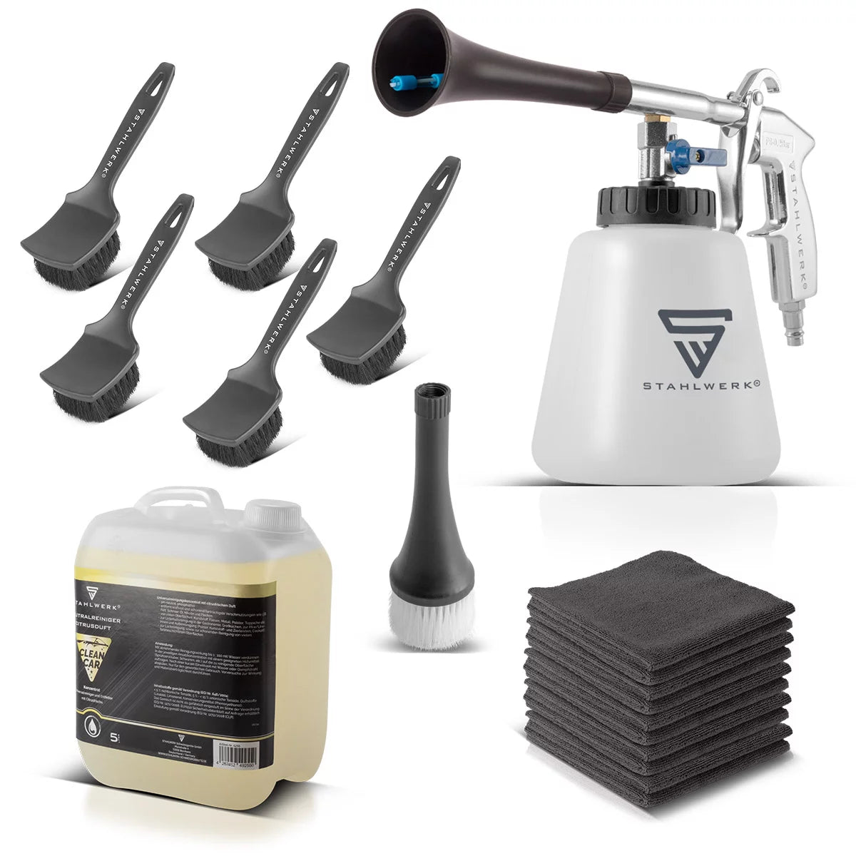 STAHLWERK Profi Druckluft-Reinigungspistole RP-90 ST im Set mit 5 Liter Universalreiniger, Felgenbürsten und Mikrofaser-Tüchern | Druckluft-Reiniger | Innenreiniger