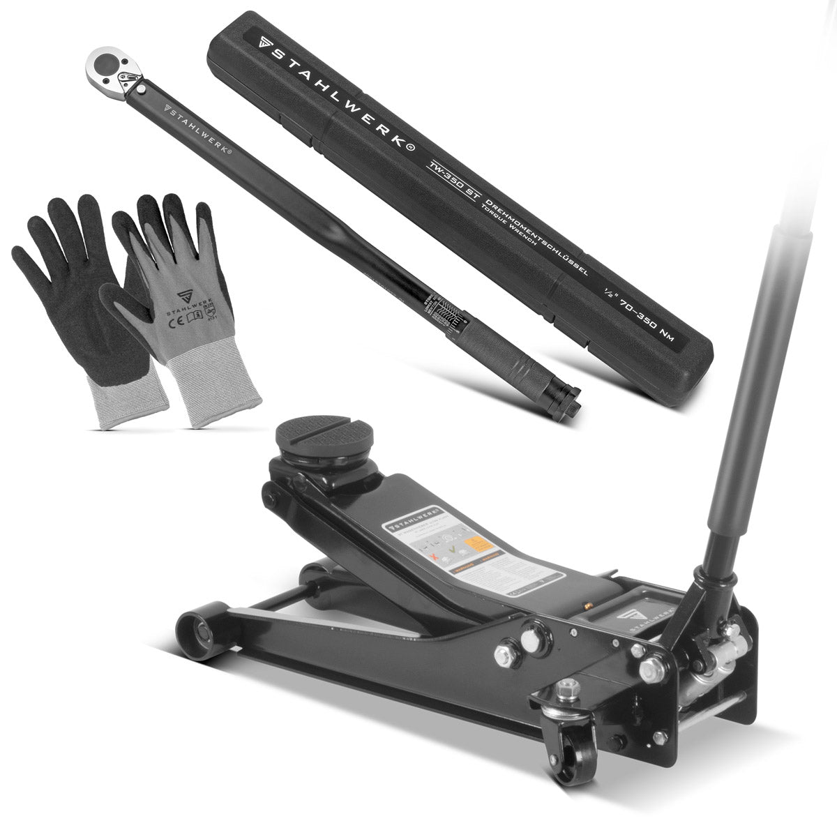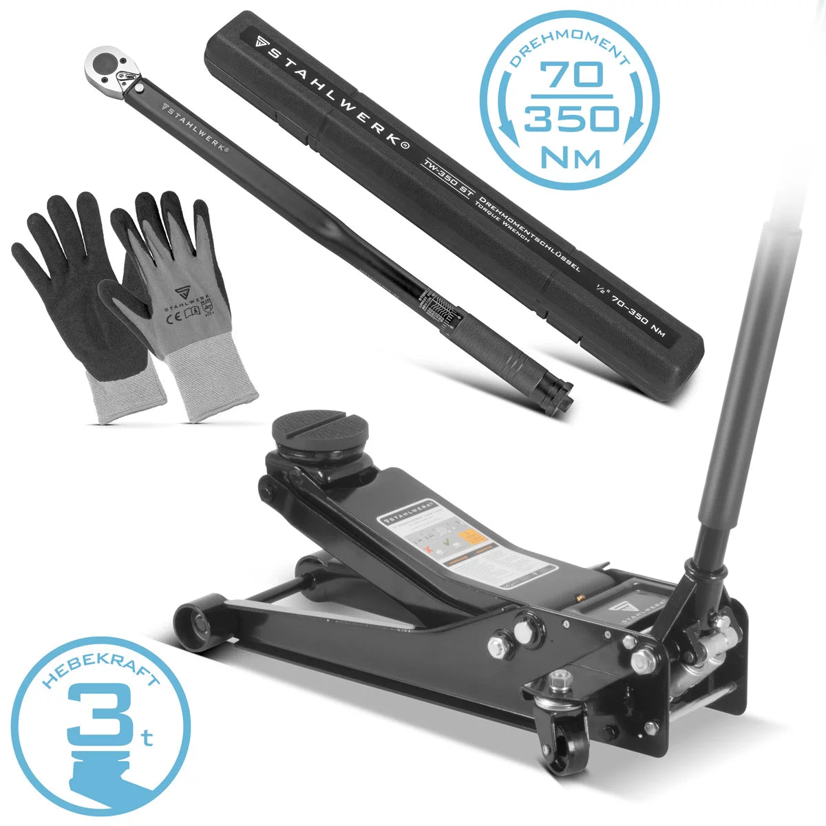 STAHLWERK Reifenwechsel-Set Basic mit extra flachem 3 t Rangier-Wagenheber mit 75-510 mm Hubbereich, Drehmomentschlüssel mit 70-350 Nm und Arbeitshandschuhen für Reifenwechsel am Kfz