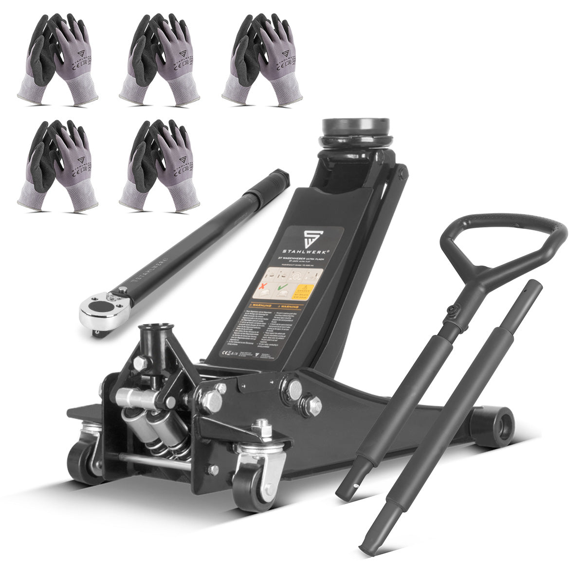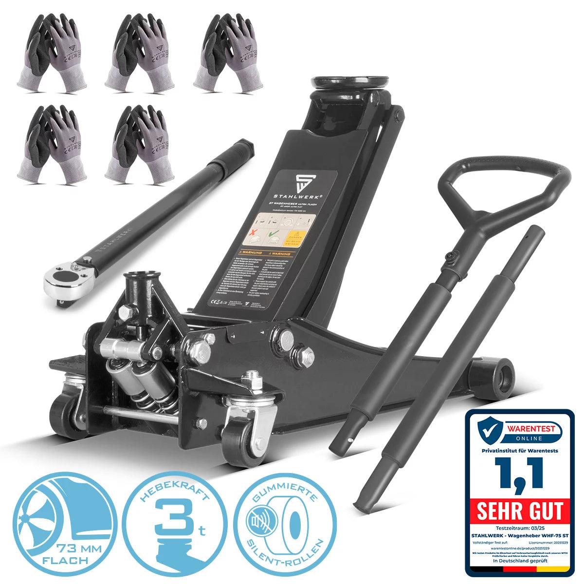 STAHLWERK Reifenwechsel Set Wagenheber WHB-73 ST mit 3 t Tragkraft, gummierten Rollen, Doppelhubkolben und 73-500 mm Hubbereich | Drehmomentschlüssel TW-350 ST mit 70-350 Nm | Arbeitshandschuhe