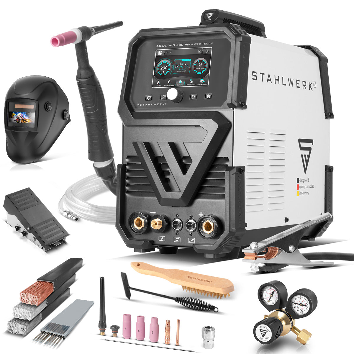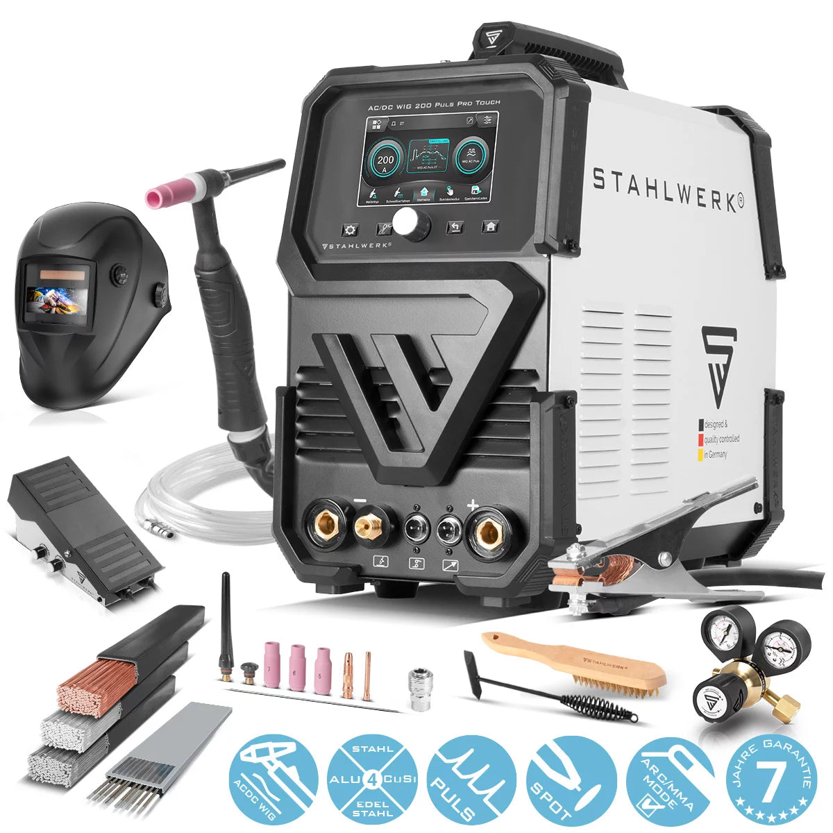 STAHLWERK Schutzgas-Schweissgerät AC/DC WIG 200 Puls Pro Touch Vollausstattung | IGBT-Inverter mit 200 Ampere | ARC/MMA Funktion | Job-Speicher | Puls-und Spot-Funktion geeignet für Alu und Dünnblech