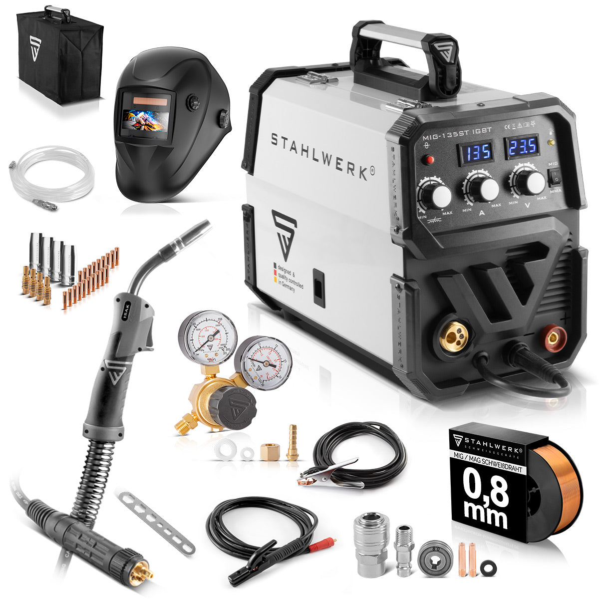 STAHLWERK Schweißgerät MIG MAG 135 ST IGBT Vollausstattung / Schutzgasschweißgerät mit synergischem Drahtvorschub und echten 135 Ampere / Kombi-Schweißgerät
