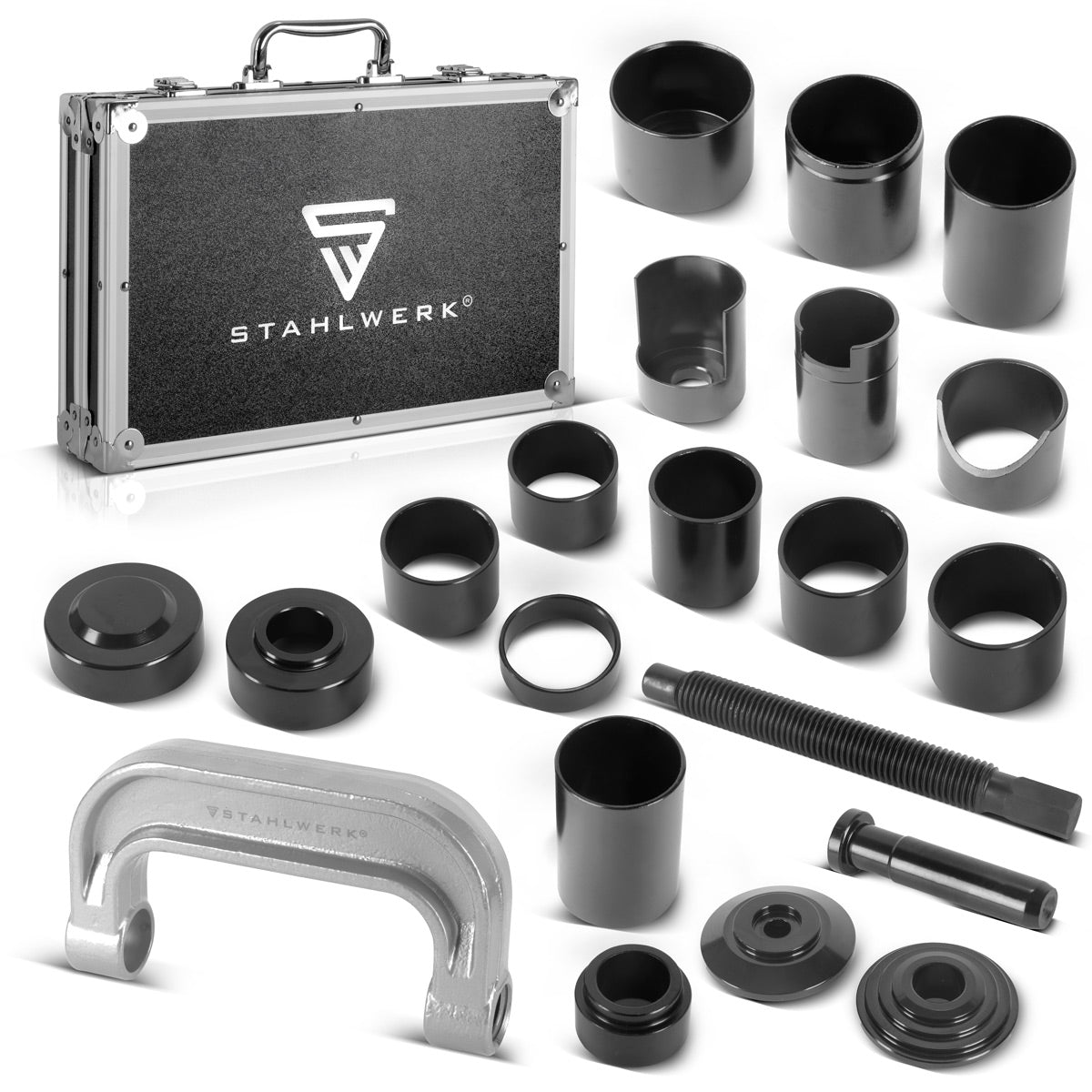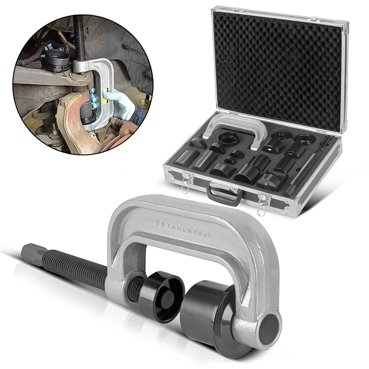 STAHLWERK Traggelenk-Abzieher | Kugelgelenk-Abzieher | Traggelenk-Presse | Kugelgelenk-Presse | Traggelenk-Ausdrücker | Kugelgelenk-Ausdrücker | 21-teiliger Werkzeug-Montagesatz