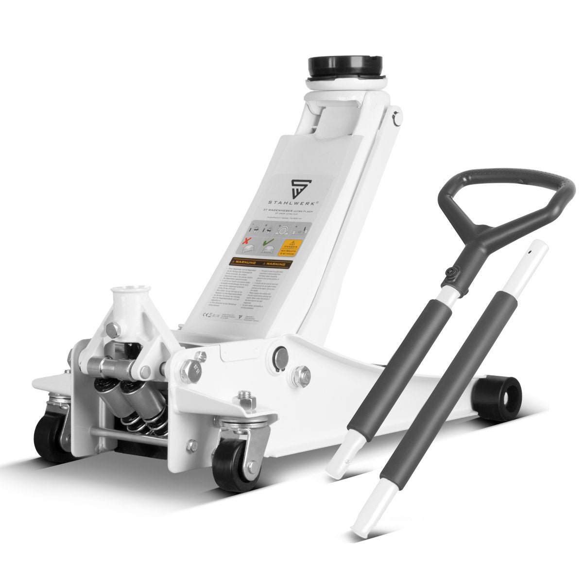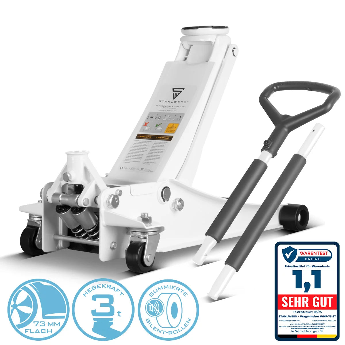 STAHLWERK Wagenheber WHW-73 ST mit 3 t Tragkraft, gummierten Rollen, Doppelhubkolben und 73-500 mm Hubbereich | extra flacher Rangierwagenheber | Hydraulik-Wagenheber | weißer Autoheber